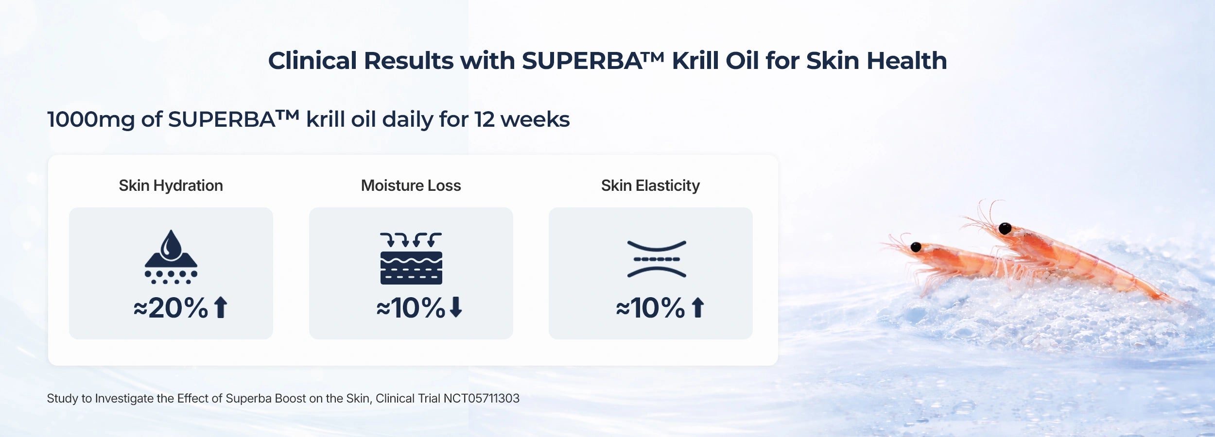 Just 1 g/day of Superba™ krill oil showed up to 20% better skin hydration, 10–15% lower moisture loss, and improved elasticity. Plus, it supported heart health with ~10% lower triglycerides and higher omega-3 levels—with no increase in LDL.